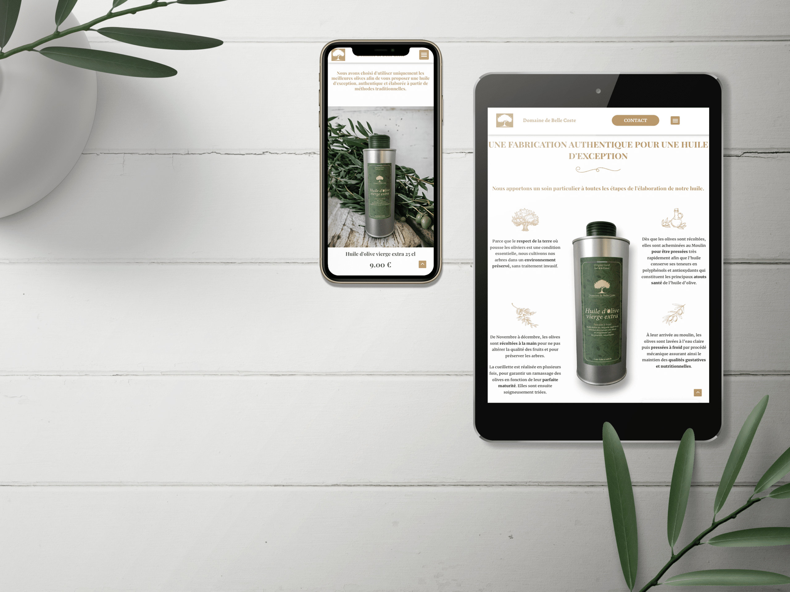 Le Domaine de Belle Coste, situé à Caissargues près de Nîmes, cultive 2 hectares d’oliviers centenaires pour produire une huile d’olive vierge extra de grande qualité. Les propriétaires souhaitaient un site élégant pour présenter leur savoir-faire et permettre la vente de leurs produits.