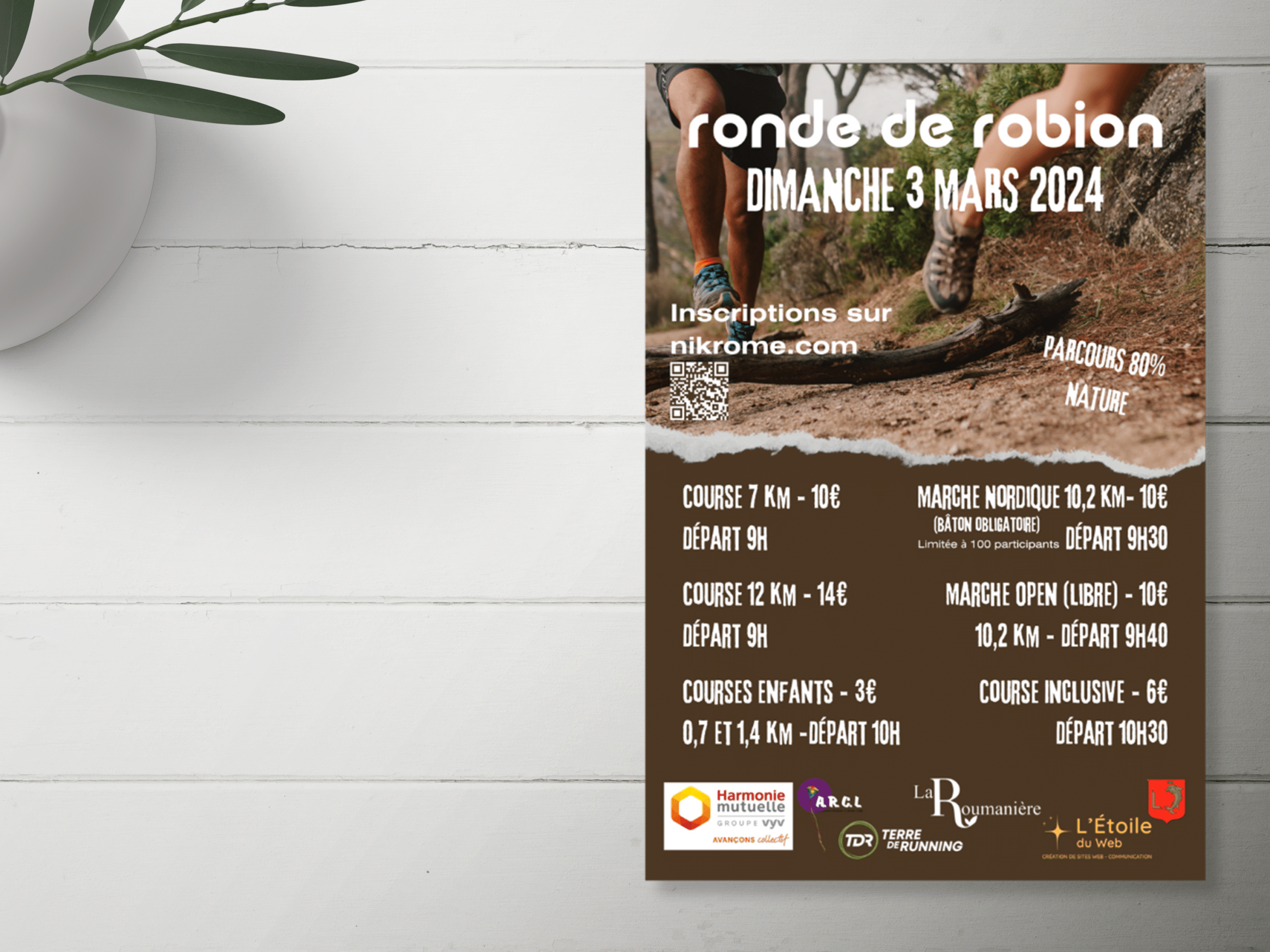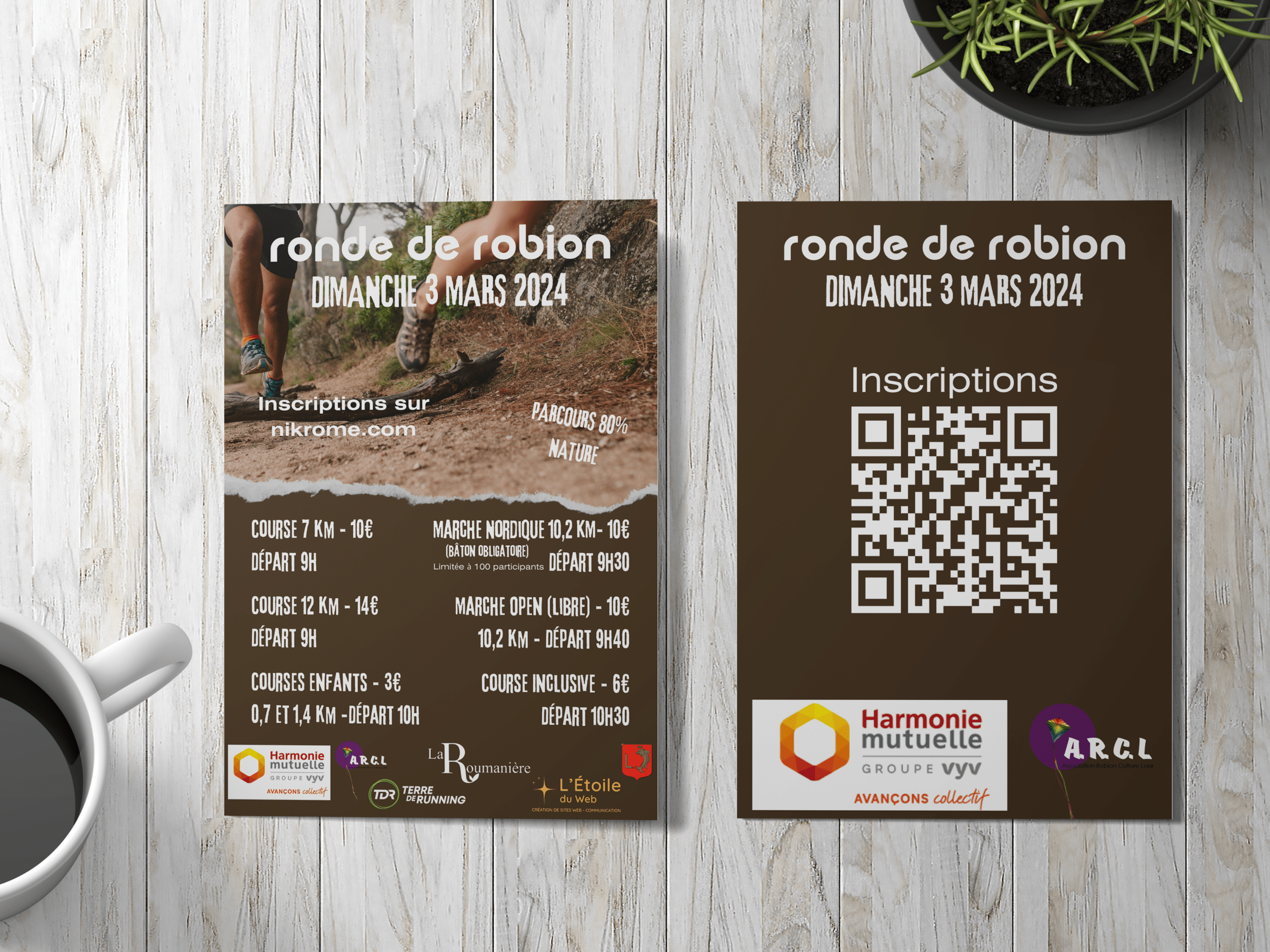 Création des flyers, affiches et banderoles pour la communication concernant la course « La Ronde de Robion » 2024 et gestion des impressions auprès d’un imprimeur.